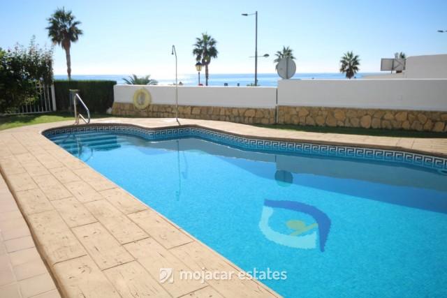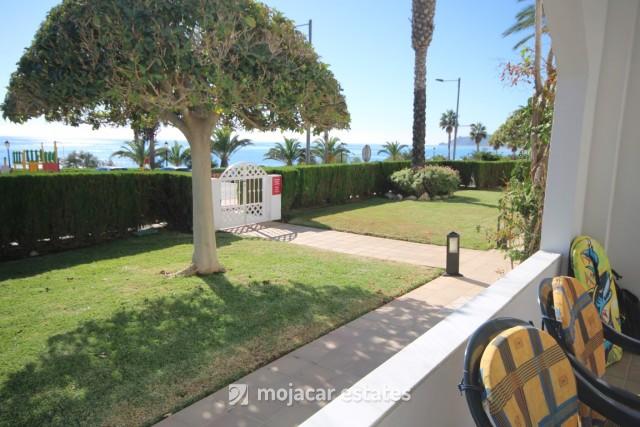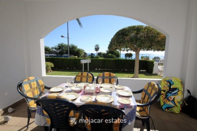 Lovely ground floor apartment for 6 people in frontline position with open sea views and in small well kept urbanisation with swimming pools and gardens located at Playa Cuevas del Lobo in the south part of Mojacar Playa and opposite the seafront promenade.