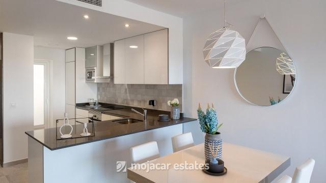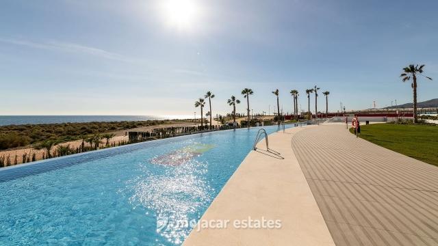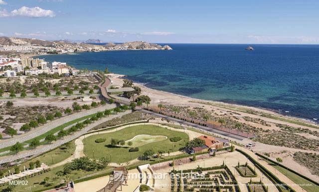 Modern, first-line apartments for sale in a newly built complex in San Juan de los Terreros, Costa de Almería, Andalusia. The development enjoys direct proximity to the beach, outstanding sea views, beautifully landscaped communal areas, and underground parking.