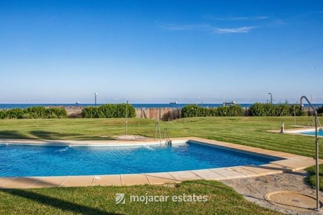 !Great opportunity first line beach in Vera Playa! 2 bed / 2 bath 1st floor apartment with large private terrace, private covered parking and storeroom. The up market residential has direct access to the promenade and the beach and within its grounds for the exclusive use of property owners and their guests there are 4 swimming pools, football and padel courts and children’s playground all in a meticulously kept garden. The community is also served by a restaurant adjacent to it with a private seating area inside the community grounds reserved for residents and their guests only.